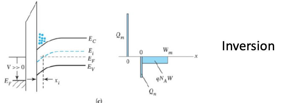 For , the energy bands bend downward even more so that the intrinsic level at the surface crosses over the Fermi level, as shown in Fig 3c. As a result, the positive gate voltage starts to induce excess negative carriers (electrons) at the