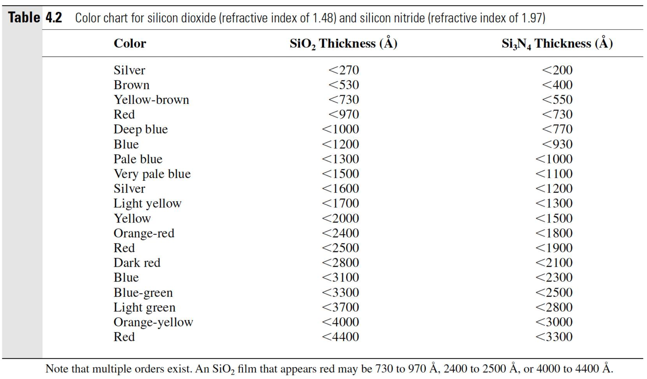 Oxide is actually colourless but due to the interference of light reflecting off the silicon and the oxide surface we get colours, as the thickness changes, so does the colour.