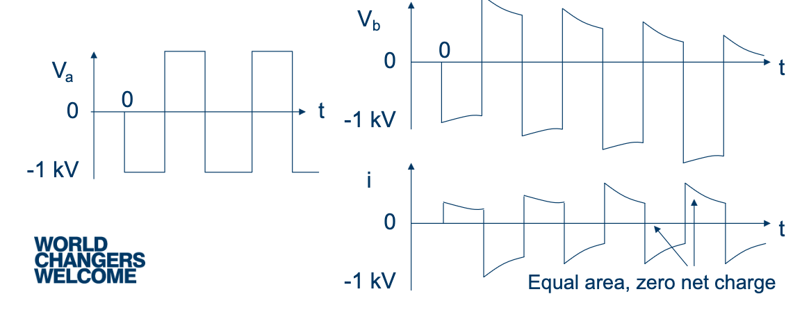 This will repeat, with the electrode gradually becoming more negative over each cycle. Eventually Vb will be negative most of the time, stabilising so that the net negative and positive charge deposited at the electrode per cycle is zero.