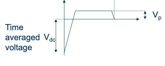 After a few cycles, the voltage Vb an hence the voltage across the plasma is strongly negative. The steady state (or DC) part of the voltage is known as the self bias voltage Vdc. If the transit time for an ion across the cathode dark space is longer than one rf cycle (this is true for low density plasmas at 13.56 MHz), the energies of the ions arriving at the surface is given by the time averaged voltage.