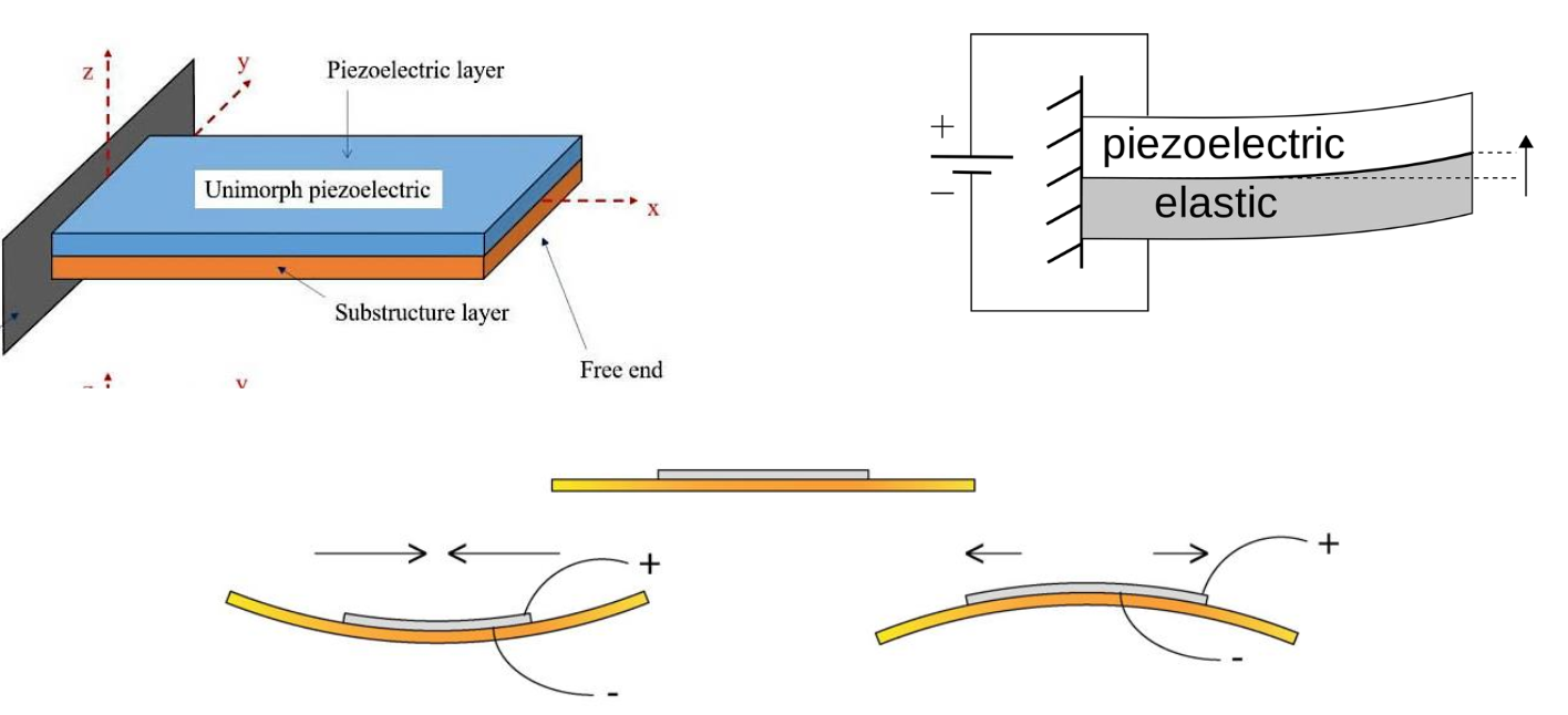 A unimorph (or monomorph) is a cantilever that consists of one active layer and one inactive layer. In the case where active layer is piezoelectric, deformation in that layer may be induced by the application of an electric field. This deformation induces a bending displacement in the cantilever. The inactive layer may be fabricated from an elastic non-piezoelectric material.