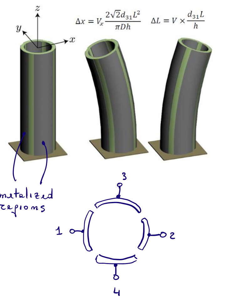 Typically, such a scanner is made from radially poled piezoelectric material consisting of four external electrodes and either a matching set of sectored internal electrodes or a single internal electrode. The benefit of sectored piezoelectric tubes is that three degrees of freedom motion with nanometer resolution can be obtained in one unit.