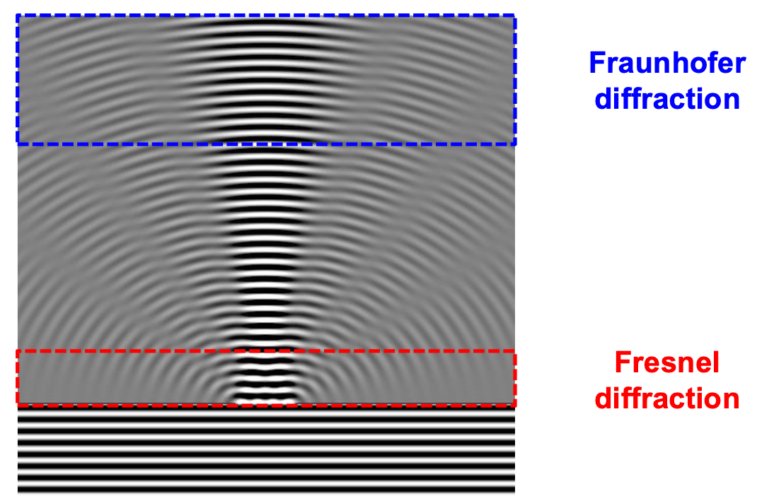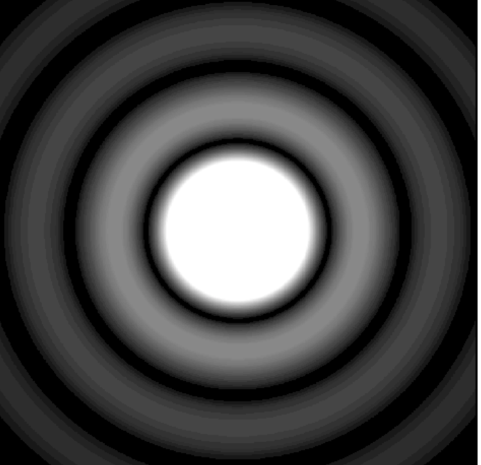 Computer generated light diffraction pattern from a circular aperture of diameter 500 nm at a wavelength of 600 nm (red-light) at distances of 0.1 cm – 1 cm in steps of 0.1 cm. One can see the image moving from the Fresnel region into the Fraunhofer region where the Airy pattern is seen.