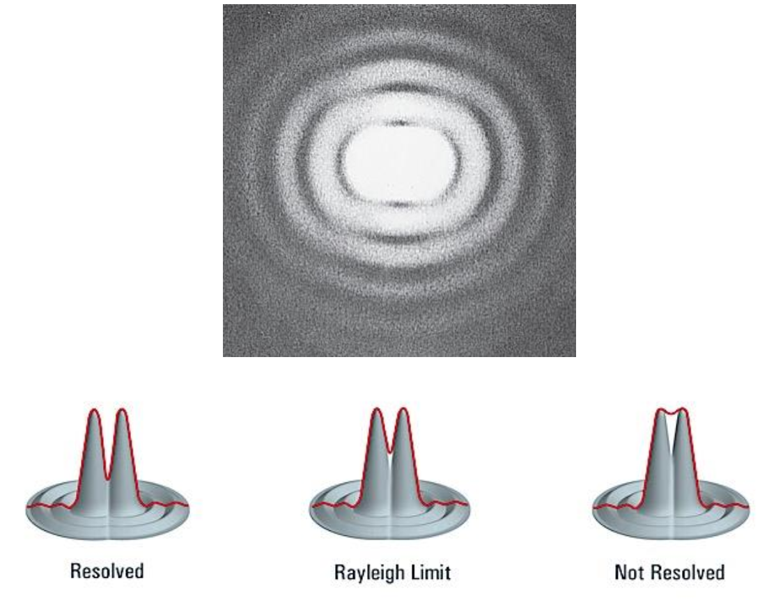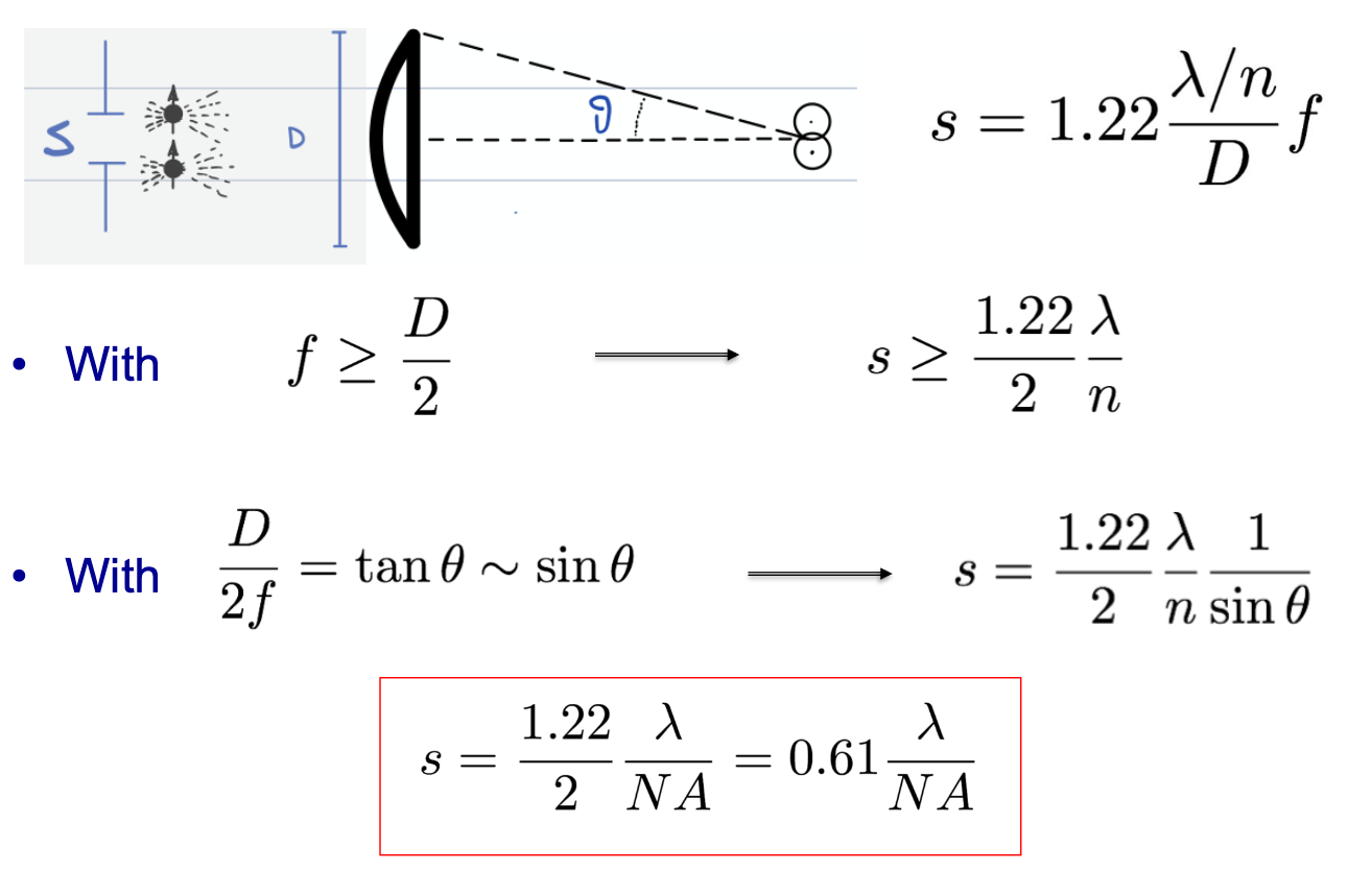 Diffraction sets an ultimate limit of resolution, which restricts the details that can be seen on an object. Since objects are normally placed near the focal point of a microscope objective, the angle subtended by two objects is . We call resolving power () the quantity :