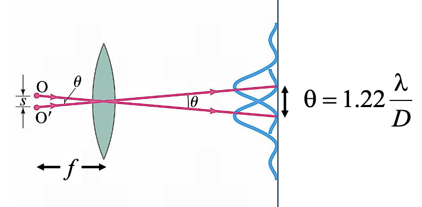 The resolution is the distance at which a lens can barely distinguish two separate objects. Resolution is limited by aberrations and by diffraction. Aberrations can be minimized, but diffraction is unavoidable; it is due to the size of the lens compared to the wavelength of the light.